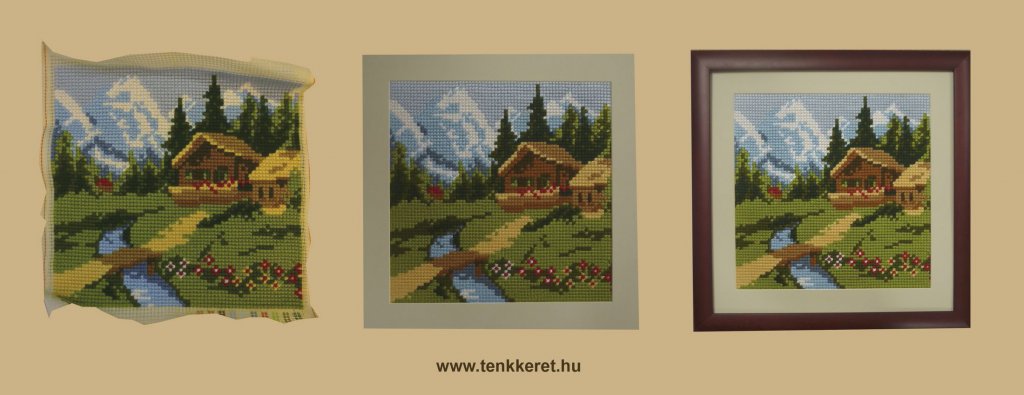 A gobelint keretezés előtt kifeszítem, feltűzöm és felkasírozom egy kartonra, hogy az oldalak derékszögbe kerüljenek és a kép felülete sima legyen. A keretezéshez legtöbbször paszpartut is ajánlok, de nagyobb méretű gobelint betétléces kerettel is keretezhetünk. Természetesen a képet üveggel védem.