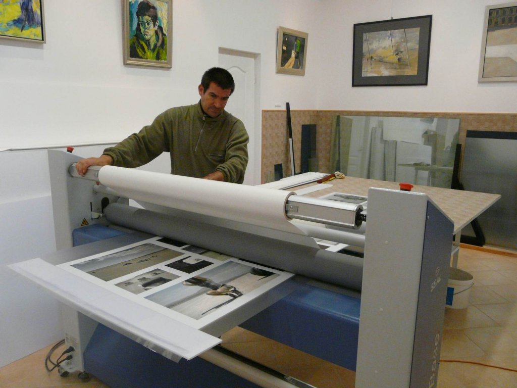 Nyomtatott képeket, fotókat, plakátokat, térképeket, tablókat, tervrajzokat keretezés előtt fel kell kasírozni (ragasztani) különben meghullámosodnak. Legtöbbször hablemezre kasírozok, mert ez egy sima felületű, könnyű anyag. Hengeres géppel120 centi szélességig és három méter hosszúságig tudok dolgozni, míg a vákuumos hőkasírozó géppel hajtogatott, gyűrött, szakadt képet, gobelint, selymet, textilt, puzzle-t tudok ragasztani. Nagyobb méretű képek elé nem ajánlok üveget, mert az üveg nehéz és könnyen összetörik, a plexi pedig nagyon drága és könnyen karcolódik. Helyette felületfóliázást javaslom. Ez az eljárás megoldást nyújt nagy méretű képek esztétikus és biztonságos felületvédelméhez és üveg nélküli keretezéséhez. A hablemezek és fóliák raktáron vannak, így rövid határidőre is tudok munkát vállalni!